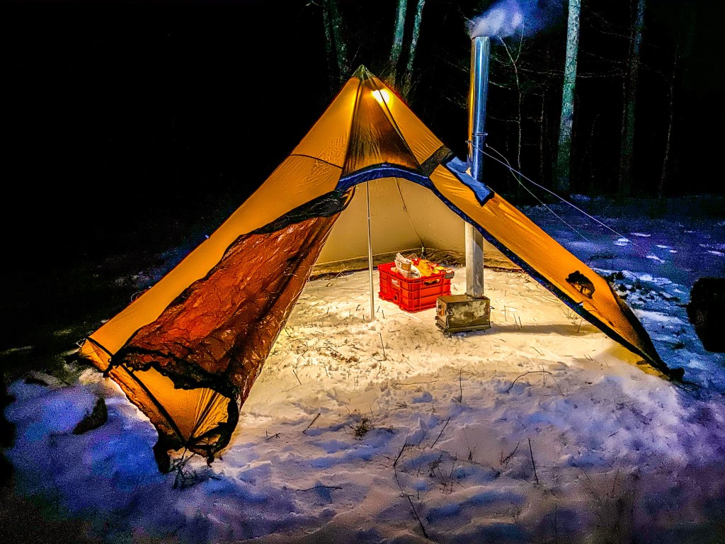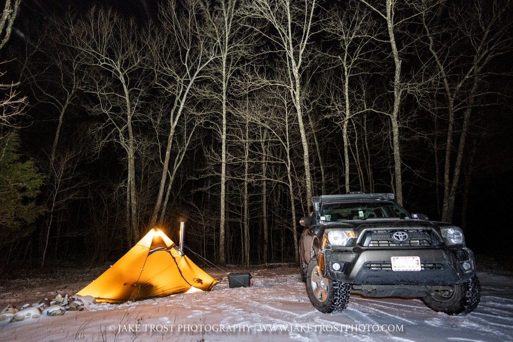 I pulled into my camp spot around 7pm or so after getting off work Friday evening. The snow-covered road leading to this camp spot had yet to receive any visitors, making me the first to travel on it. First thing I did when I got to my spot was setup my tent and stove. Most importantly, getting that fire going and warming up the inside.